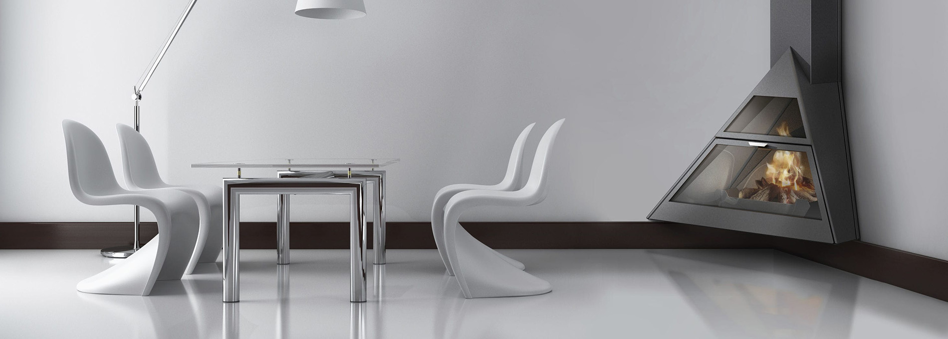 Uma lareira da sala do meio projetada para apreciar a vista do fogo de qualquer ângulo.